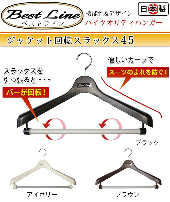 回転式バーは、スラックスを取るときに回転し取り出しやすくなっていて便利! ベーシックなブラックと、落ち着いたブラウン・アイボリーの雰囲気に合わせて選べる3カラー! 肩幅も36・40・45・50cmと4サイズ揃っているので、あらゆるサイズに対応。