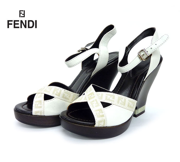 【FENDI】フェンディミニズッカ柄 ウッドソールストラップ サンダルサイズ37 約23.5cmホワイト×ブラウン FA0307【中古】
